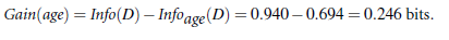 Similarly, we can compute Gain(income) = 0.029 bits, Gain(student) = 0.151 bits, and Gain(credit rating) = 0.048 bits. Because age has the highest information gain among the attributes, it is selected as the splitting attribute. Node N is labeled with age, and branches are grown for each of the attribute’s values.